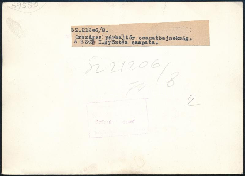 https://www.darabanth.com/en/454-Online-auction/454.0/Photography/Photo~500023/cca-1968-Parbajtor-Orszagos-Bajnoksag-SZOT-I-gyoztes-csapat-Szecsenyi-Jozsef-pecsettel-je~II3027306