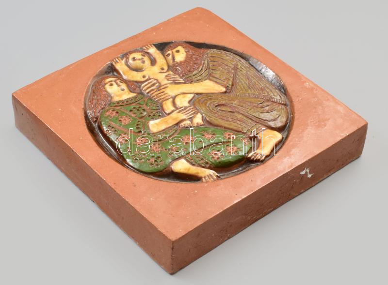 Andróczi Alajos (1937-): Család. Mázas samottos kerámia falikép, hátoldalán jelzett, hibátlan 24x23 cm