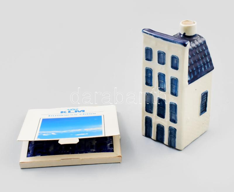 2 db KLM holland légitársaság porcelán emléktárgy az első osztályról. Pálinkás butéla 10 cm, porcelán kép 8x8 cm