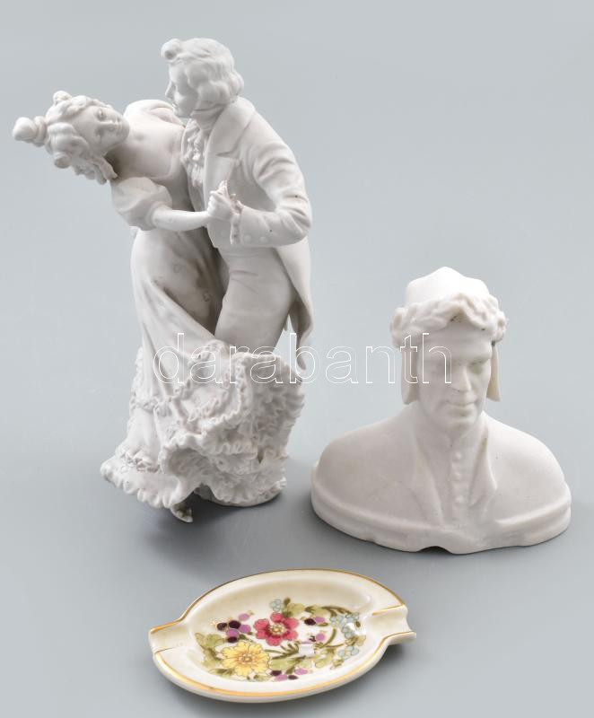 Description: 3 db tétel: Zsolnay virág mintás tálka Kézzel festett, jelzett, hibátlan 12 cs + egy sérült, jelzés nélküli párt ábrázoló porcelán 22 cm + egy jelzés nélküli kis l epattanással m: 18 cm