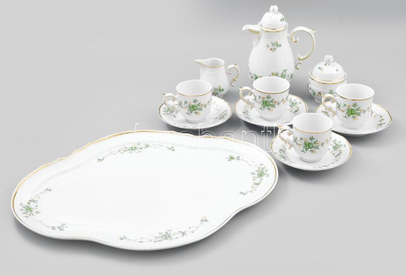 Hollóházi Erika mintás téte á téte mokkás készlet, 4 személyes, matricás, dombormintás, minimális kopottsággal, jelzéssel.
