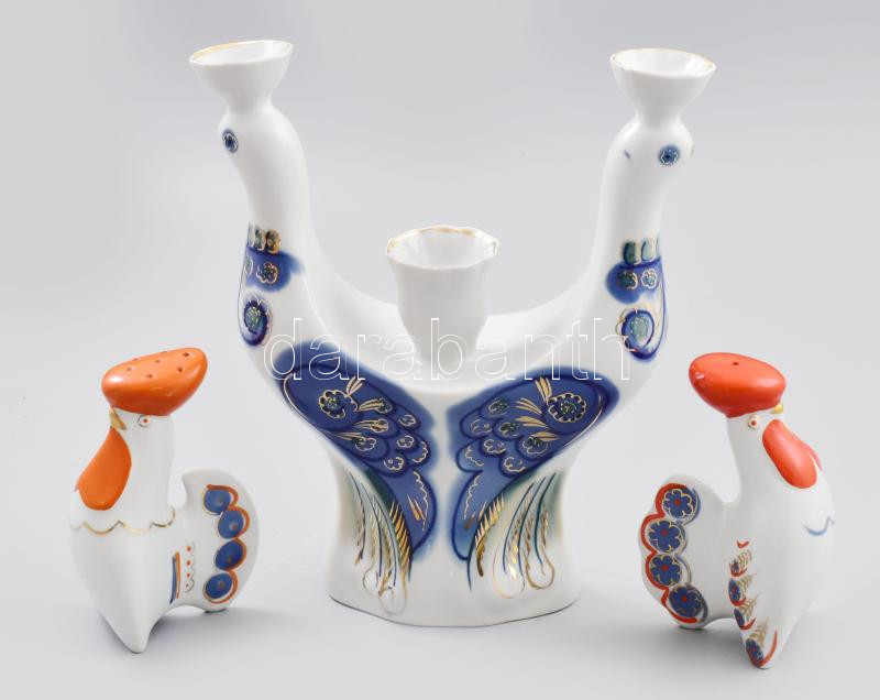 Szovjet porcelán madaras gyertyatartó, 20x17,5x7,5 cm + Kakasos só- és borsszóró, m: 10 cm. Kézzel festett, jelzett, apró felületi hibákkal.