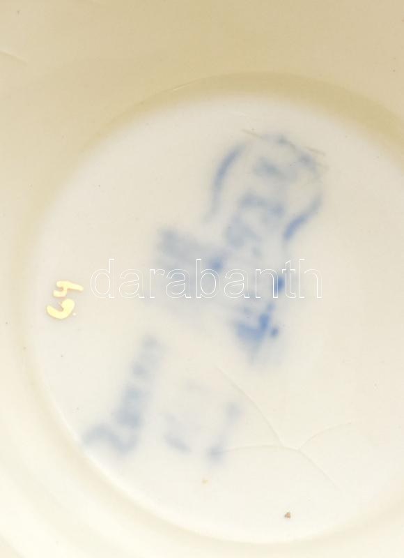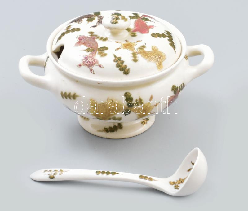 Zsolnay aranyhal mintás szószkínáló tál kanállal. cca 1885, magastüzű mázakkal festett finomfajansz, aranykontúrozott aranyhal mintákkal díszítve. Fedél belsején sérülés, hiány. Alján jelzett: máz alatti kobaltkékkel családi jegy, d: 20 cm, m: 13 cm, kanál h: 17,5 cm /// A Zsolnay-család tagjai keleti utazásaikról küldték haza az ott megismert kínai porcelánokat, kezdetben ezeket igyekeztek utánozni a pécsi Zsolnay gyárban. A jelen aukción szereplő szószkínáló is kínai előképeket követ: sajátos felülnézeti perspektívából úszkáló aranyhalakat és hínárnövényeket ábrázol, aranykontúrozással. Rendkívül ritka gyűjtői darab.