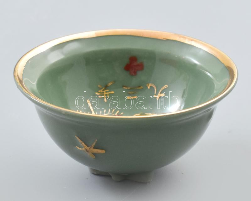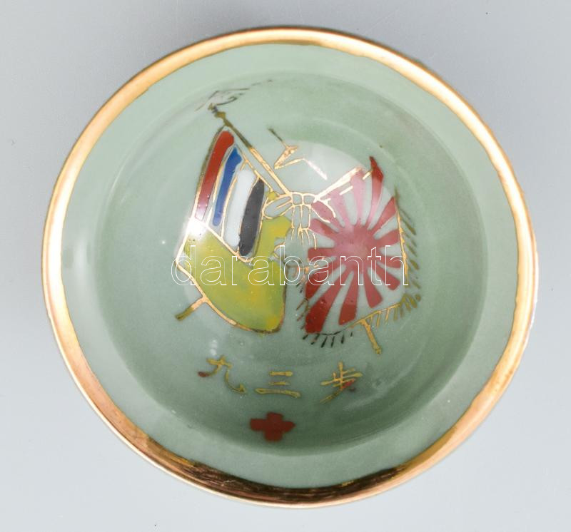 Description: cca 1940, Mandzsukuo, Szakés csésze. Japán légierő, Mandzsukuoban szolgáló pilóta, festett porcelán, alján plasztikus repülő alakkal. Minimális kopással, d: 5,5 cm, m: 3 cm