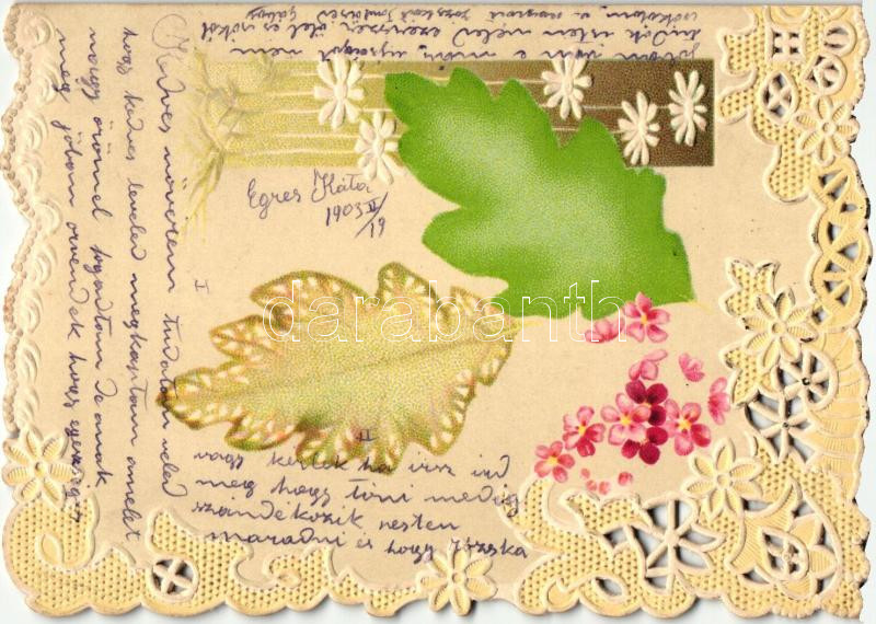 Dombornyomású művészlap csipkemintás szélekkel / Emb. art postcard, Embroidery style (12,2 cm x 8,8 cm) (EK)