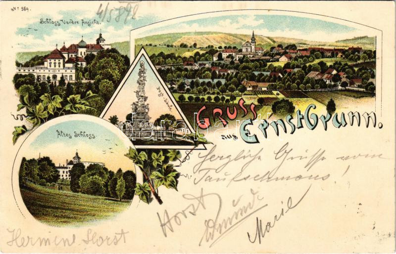 1898 (Vorläufer) Ernstbrunn, Schloss Vordre Ansicht, Altes Schloss, Pest Säule / castle, monument. Art Nouveau, floral, litho