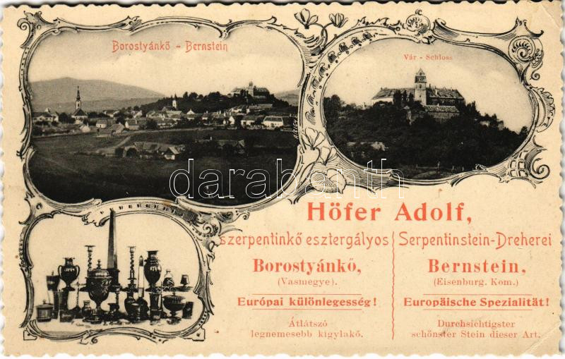 Borostyánkő, Bernstein (Vasmegye); Vár. Höfer Adolf szerpentinkő eszte... https://www.darabanth.com/en/454-Online-auction/454.0/Postcards/Burgenland~1000011/Borostyanko-Bernstein-Vasmegye-Var-Hofer-Adolf-szerpentinko-esztergalyos-szecesszios-rek~II3029867
