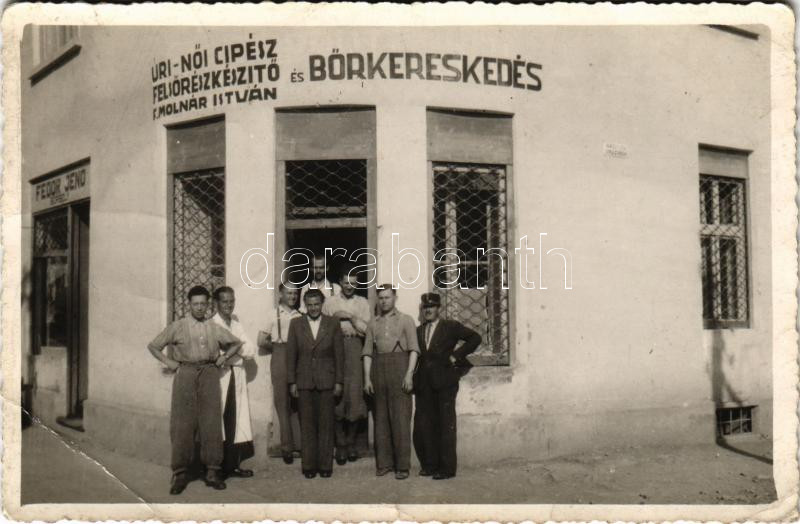 ~1940 Rahó, Rachov, Rahiv, Rakhiv; Rákóczi utca, F. Molnár István úri-női cipész, felsőrészkészítő és bőrkereskedés üzlete, Fedor Jenő borbély / street, shoemaker's shop, barber. photo (EB)