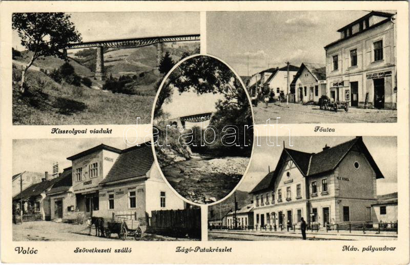 Volóc, Volovec, Volovets; Kisszolyvai viadukt, vasúti híd, Fő utca, Cikta, S. József üzlet, Szövetkezeti szálló, MÁV pályaudvar, vasútállomás, Hangya üzlete és étterme. Márton Jenő kiadása / railway bridge, viaduct in Skotarska, main street with shops, hotel, railway station