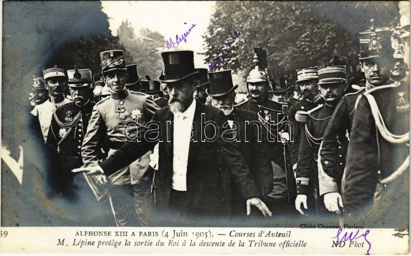 1905 Paris, Alphonse XIII, Courses d'Auteuil M. Lépine protege la sortie du Roi a la descente de la Tribune officielle / Alfonso XIII visiting Paris / XIII. Alfonz spanyol király látogatása Párizsban (EK)