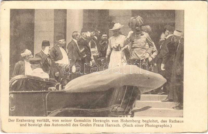 Der Erzherzog verläßt, von seiner Gemahlin Herzogin von Hohenberg begleitet, das Rathaus und besteigt das Automobil des Grafen Franz Harrach. Die Todesfahrt des Erzherzogs Franz Ferdinand. Sarajevo, 28. Juni 1914. Österr. Heeresmuseum / minutes before the assassination of Archduke Franz Ferdinand of Austria and his wife Sophie in 1914 (the trigger to WWI) (EK)