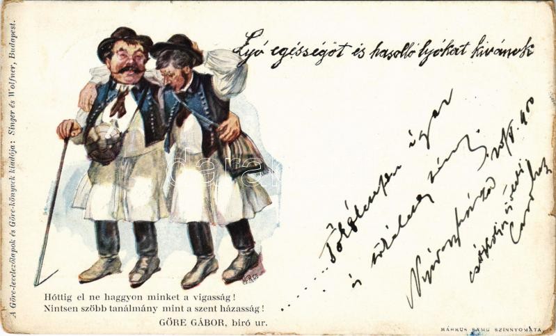 Description: 1900 Göre Gábor bíró úr. Göre levelezőlapok és Göre könyvek kiadója Singer és Wolfner. Márkus Samu színnyomata / Hungarian humorous folklore rhyme, drunk men (kopott sarkak / worn corners)