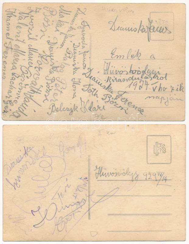 Budapest II. Hűvösvölgyi kirándulás csoportképe, hátoldalon nevek - 2 db eredeti fotó képeslap