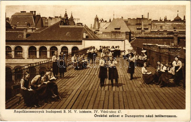 Budapest V. Angolkisasszonyok budapesti BMV intézete, óraközi szünet a Dunapartra néző tetőteraszon. Váci utca 47. (EK)