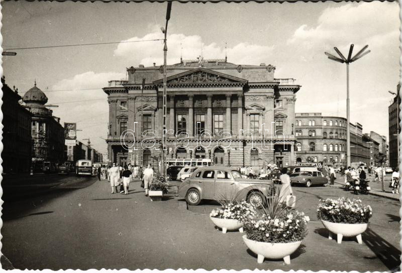 Budapest VIII. Nemzeti Színház (Népszínház) A Blaha Lujza téren, automobilok, autóbuszok, villamos. Képzőművészeti Alap (EK)