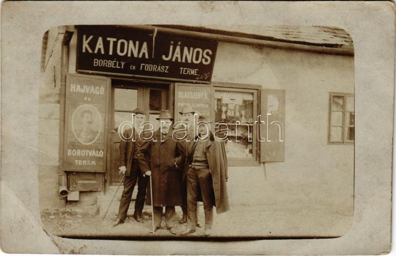 Ismeretlen település, Katona János borbély és fodrász terme, hajvágó és borotváló terem, üzlet. photo (fa)