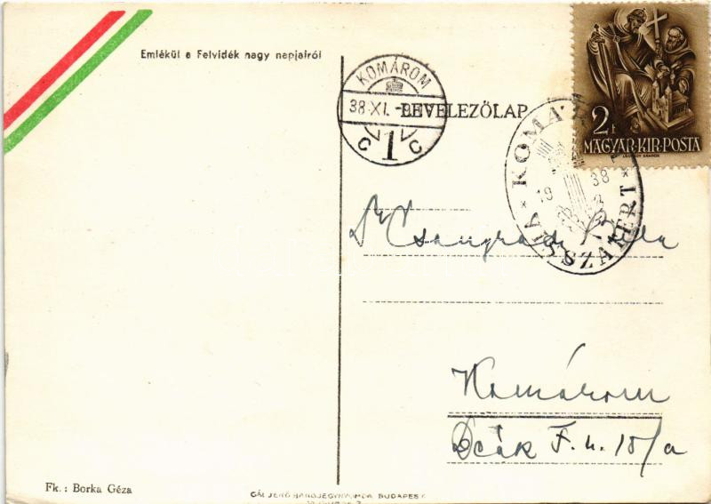 Description: Mindent vissza! Magyar palotás "Emlékül a Felvidék nagy napjairól" Irredenta kottás lap / Hungarian irredenta propaganda song, music sheet + "1938 Komárom visszatért" So. Stpl. (EK)