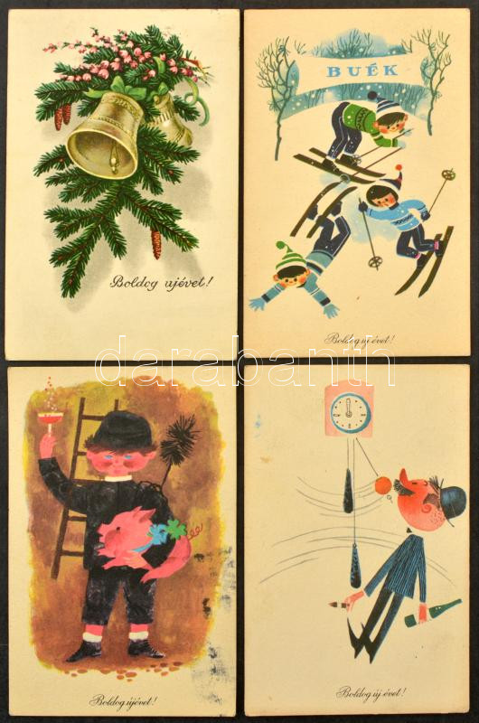 Description: 39 db MODERN magyar retro újévi grafikai üdvözlő képeslap vegyes minőségben / 39 modern Hungarian retro New Year graphic greeting postcards in mixed quality