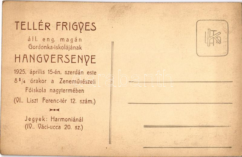 Radó Magda. Tellér Frigyes áll. eng. magán Gordonka iskolájának hangve... https://www.darabanth.com/en/454-Online-auction/454.0/Postcards/Music-Musicians~1000116/Rado-Magda-Teller-Frigyes-all-eng-magan-Gordonka-iskolajanak-hangversenye-1925-aprilis-15~II2984457