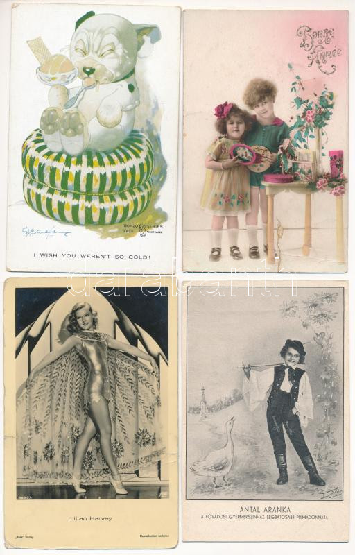 37 db régi sérült képeslap, több litho, több szignós, sok Studdy Bonzó és régi külföldi színészfotó, térképes lap, üdvözlő, művész