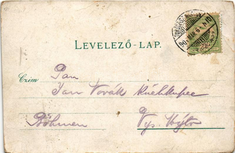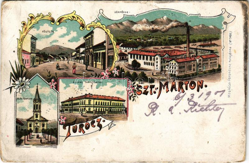 1901 Turócszentmárton, Turciansky Svaty Martin; Fő utca, Ágostai evangélikus templom, Állami tanintézetek, sörfőzde. Moskóczi Ferenc / main street, church, schools, brewery. Art Nouveau, floral, litho (EB)