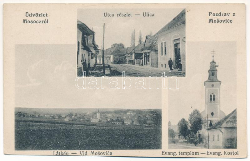 Mosóc, Mosovce; utca, evangélikus templom. Nagy Sándor kiadása / stree...