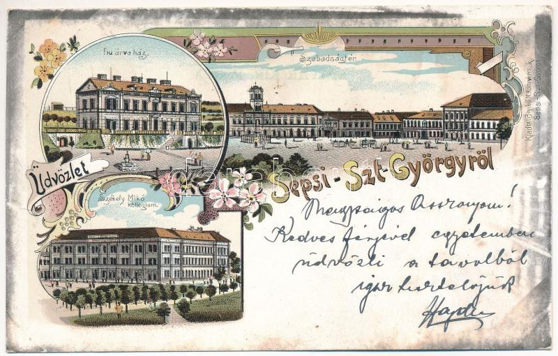 1899 (Vorläufer) Sepsiszentgyörgy, Sfantu Gheorghe; Fiú árvaház, Szabadság tér, piac, Székely Mikó kollégium. Benkő M. kiadása / boy orphanage, square, market, Calvinist boarding school. Art Nouveau, floral, litho