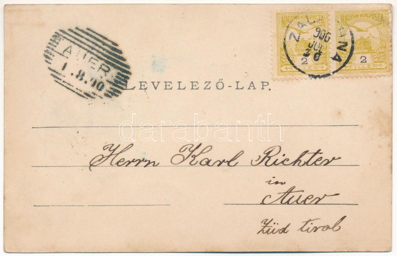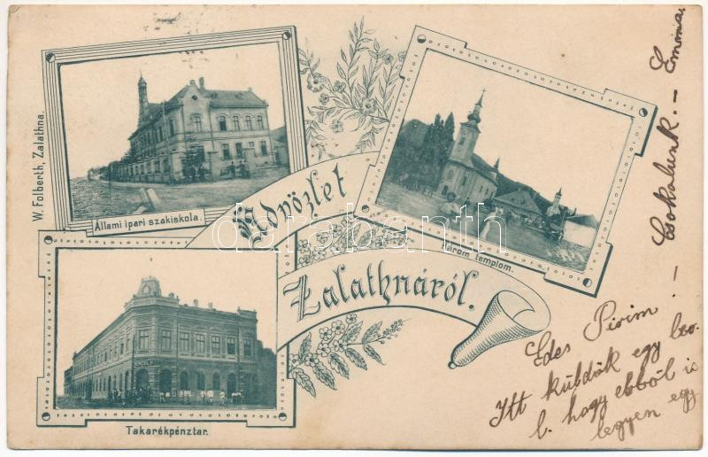 Description: 1900 Zalatna, Zlatna; Állami ipari szakiskola, Három templom, Takarékpénztár. W. Folberth kiadása / industrial school, churches, savings bank. Art Nouveau, floral (EK)