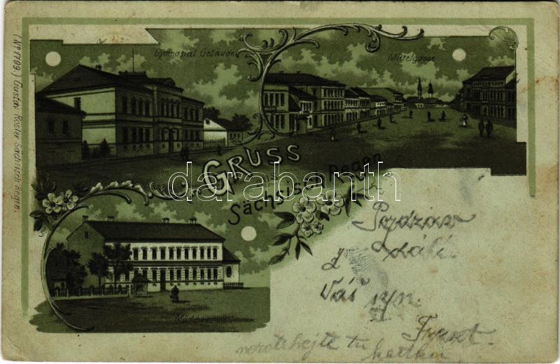 1901 Szászrégen, Reghin; Gymnasial Gebäude, Mittelgasse, Mädchenschule / gimnázium, Közép utca, Leányiskola. Gustav Rösler kiadása / grammar school, street view, girls' school. Art Nouveau, floral, litho (ázott / wet damage)