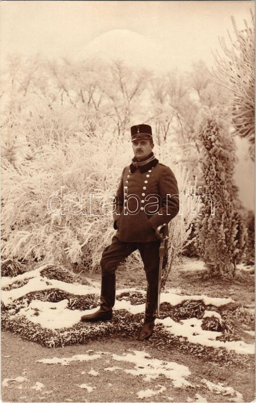 1915 Nagyszeben, Hermannstadt, Sibiu; Osztrák-magyar katona télen karddal az oldalán / K.u.k. military, soldier in winter. Emil Fischer photo
