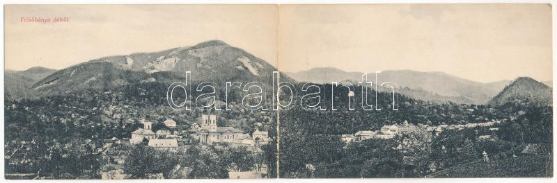 Felsőbánya, Baia Sprie; látkép délről, templom. A Gutini választmány kiadása, 2-részes kihajtható panorámalap / general view, church. 2-tiled folding panoramacard (hajtásnál szakadt / torn at fold)