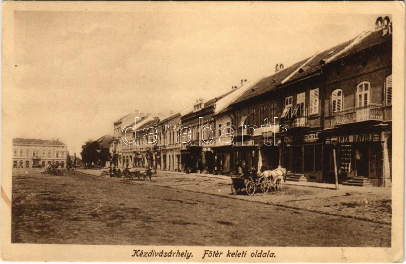 Kézdivásárhely, Targu Secuiesc; Fő tér keleti oldala, Mánya Dávid és Császár Gergely üzlete / main square, shops (EK)