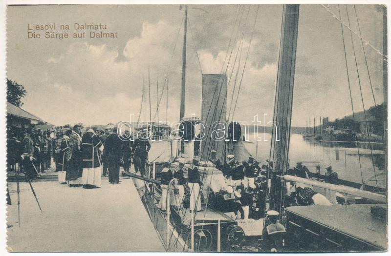 1914 Metkovic, SMS DALMAT osztrák-magyar haditengerészet vitorlás gőzjachtja, Ferenc Ferdinánd trónörökös és felesége Chotek Zsófia koporsóinak a fedélzetre helyezése az SMS Viribus Unitis-ra való továbbszállításhoz, vallási vezetők és tisztek / K.u.K. Kriegsmarine Die Särge auf Dalmat / Austro-Hungarian Navy, coffins of Franz Ferdinand the Heir to the Throne and his wife Sophie are brought on board SMS Dalmat on June 30, 1914, to be transferred to SMS Viribus Unitis, waiting offshore to take them to Trieste. J. Nikolac (EB)