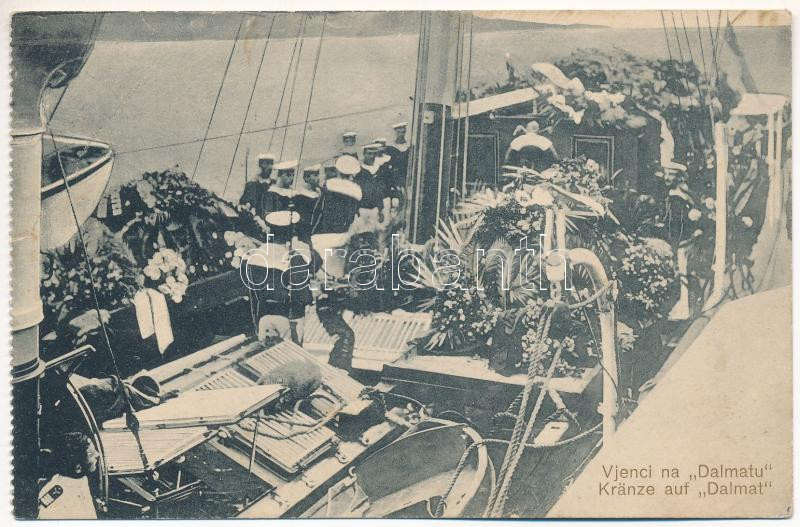 Description: 1914 Metkovic, SMS DALMAT osztrák-magyar haditengerészet vitorlás gőzjachtja, Ferenc Ferdinánd trónörökös és felesége Chotek Zsófia koporsói a fedélzeten koszorúkkal / K.u.K. Kriegsmarine Kränze auf Dalmat / Austro-Hungarian Navy, coffins of Franz Ferdinand his wife Sophie covered with wreaths. J. Nikolac
