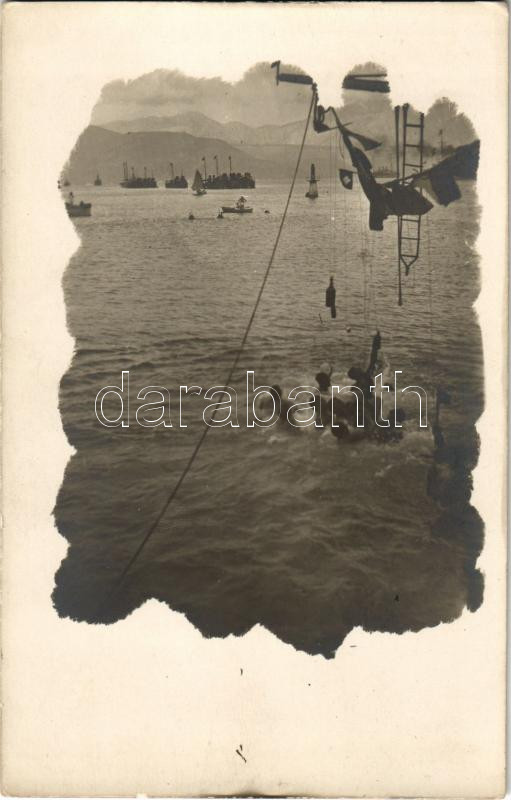 1915 Osztrák-magyar matrózok mulatságos versenye, alkoholos italok az SMS Zara Osztrák-Magyar Monarchia Zara-osztályú torpedóhajójának (őrhajó) spárgájára kötve, aki eléri valamelyik üveget azé az ital jutalmul / K.u.K. Kriegsmarine Matrosen / Austro-Hungarian Navy, funny competition of SMS Zara in the sea, mariners should catch the bottles. photo