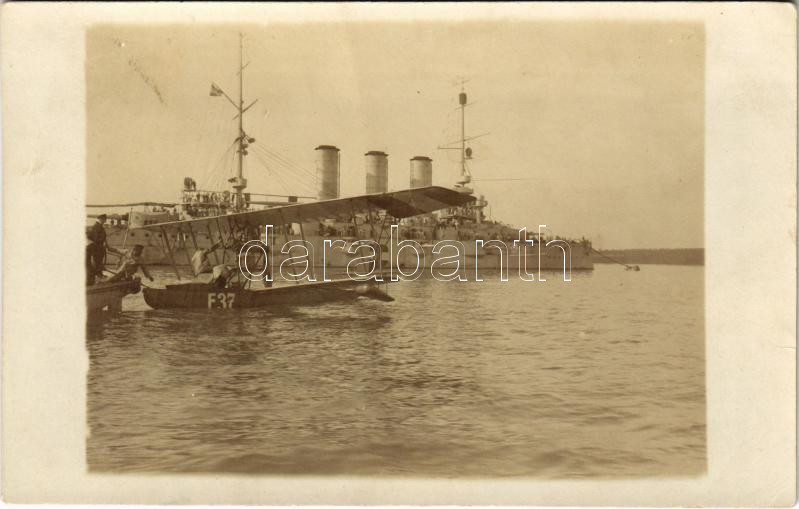 K.u.K. Kriegsmarine Seeflugzeug / WWI Austro-Hungarian Navy, Mn-type flying boat (hydroplane) E-37 next to an Erzherzog Karl-class battleship, naval aircraft, mariners. photo (EK)