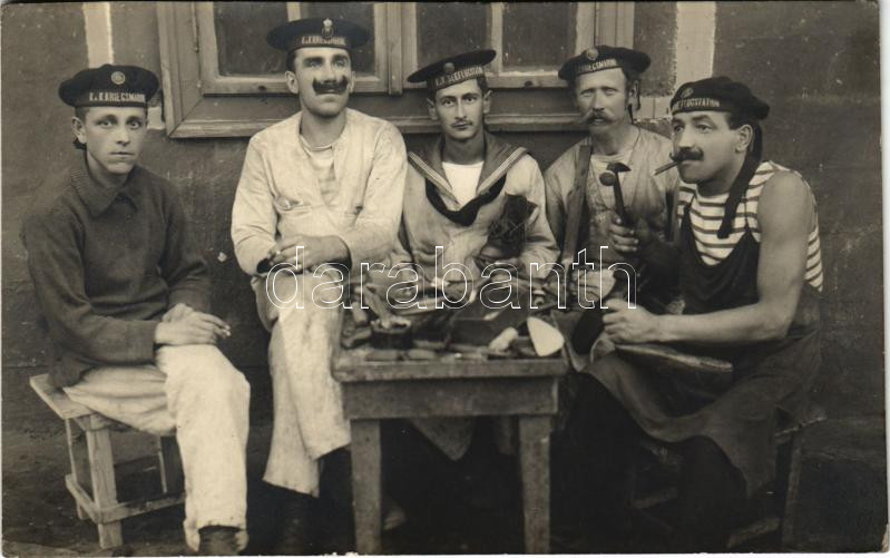 Description: Pola, Pula; K.u.K. Kriegsmarine Matrosen / WWI Austro-Hungarian Navy, Four sailors sit around the shoemaker's workbench at a flying boat (hydroplane) station. photo (EK)