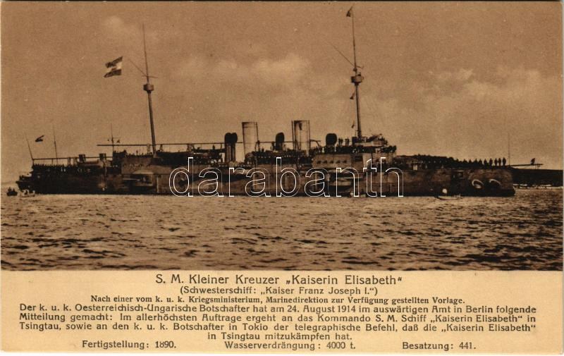 SMS Kaiserin Elisabeth az Osztrák-Magyar Haditengerészet Ferenc József... https://www.darabanth.com/en/454-Online-auction/454.0/Postcards/Warships~1000083/SMS-Kaiserin-Elisabeth-az-Osztrak-Magyar-Haditengereszet-Ferenc-Jozsef-osztalyu-vedett-cirkal~II3025824