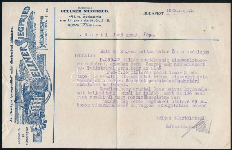 1932 Gellner Siegfried Csokoládé- és Cukorkagyár indigótintás gépelt Ü...