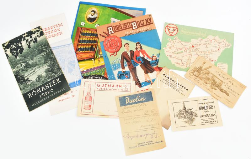 cca 1900-1950 Vegyes reklám tétel, 10 db, közte Rónaszék fürdő prospektus, Kirsch János sajt-, vaj, szalámi- és csemege-áru nagykereskedő számolócédulája, Csernák Lajos mindszenti borkereskedő kitűnő asztali bor címke, Révai Nagy Lexikon prospektus, Győri Lakkgyár, Reichhold és Boecking Győr reklámlap, Ruházati bolt kisplakát, ...stb.