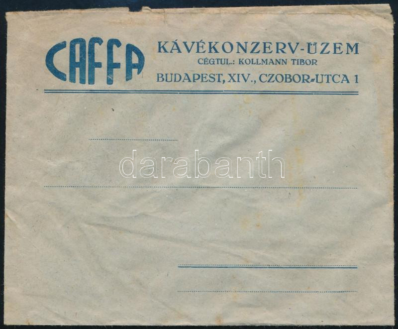 cca 1940 Caffa Kávékonzerv-Üzem, cégtul. Kollmann Tibor, Budapest XIV. Czobor u. 1 céges boríték