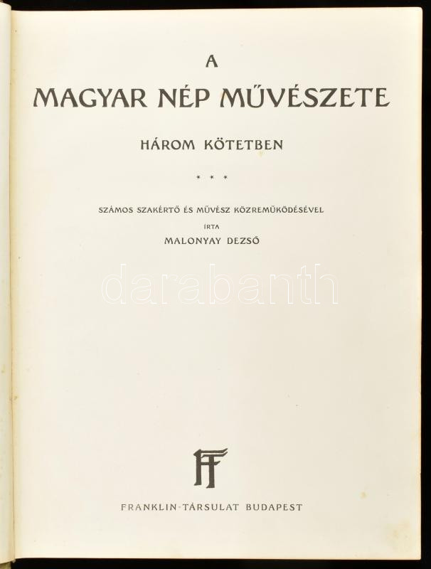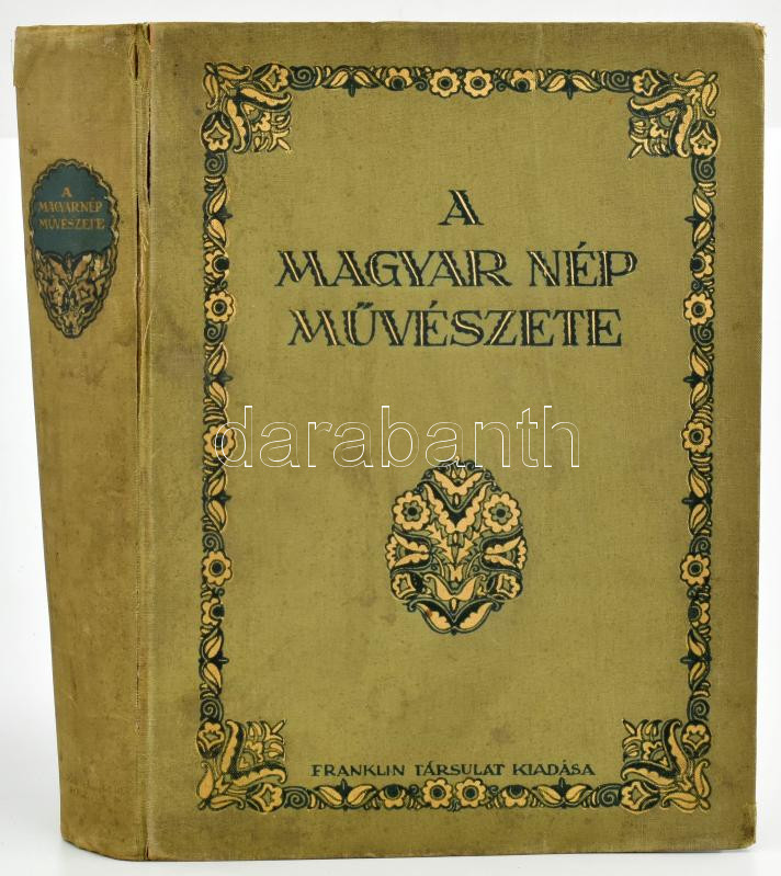 Malonyay Dezső: A magyar nép művészete három kötetben. III. kötet: A palócokról. Bp.,én.,Franklin, 4+333 p., XXIV t. (színes képek), 52 t. (fekete-fehér képek). Bp.,én.,Franklin, III-VIII, XI-XIV, XVIII-XXIV (színes táblák) t. + 52 (fekete-fehér táblák) t. Kiadói aranyozott egészvászon-kötés, kopott, foltos borítóval, sérült gerinccel, 6 hiányzó színes táblával.