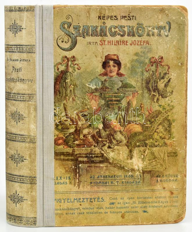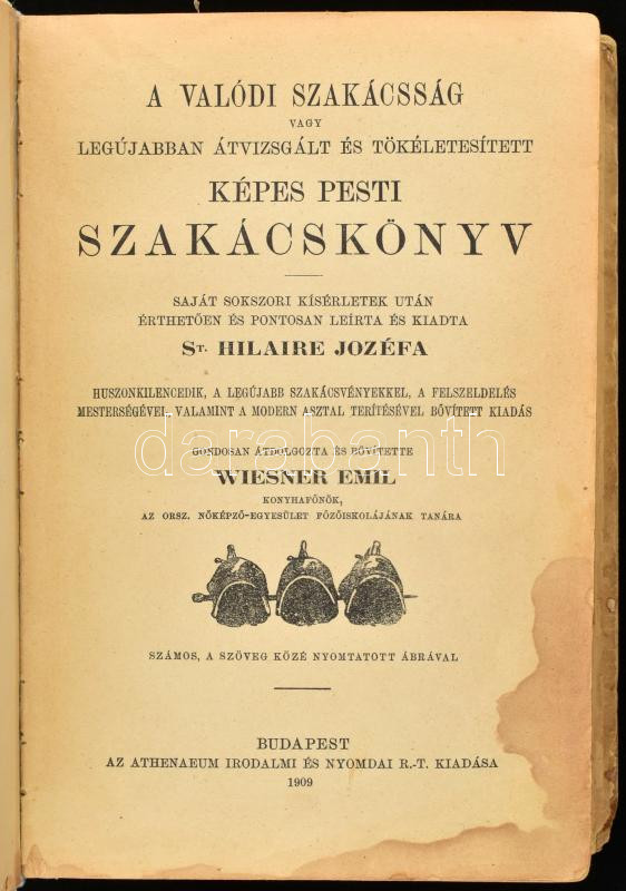 St. Hilaire Jozéfa: A valódi szakácsság vagy legujabban átvizsgált és tökéletesített Képes pesti szakácskönyv. Saját sokszori kísérletek után érthetőn és pontosan leírta és kiadta: - -. Huszonkilencedik, a legújabb szakácsvényekkel, a felszeldelés mesterségével, valamint a modern asztal terítésével bővített kiadás. Gondosan átdolgozta és bővítette Wiesner Emil konyhafőnök, az Orsz. Nőképző-egyesület főzőiskolájának tanára. Számos szöveg közé nyomtatott ábrával. Bp., 1909, Athenaeum, XIX+484 p. Javított gerincű illusztrált félvászon-kötésben, kopott borítóval, foltos lapokkal.