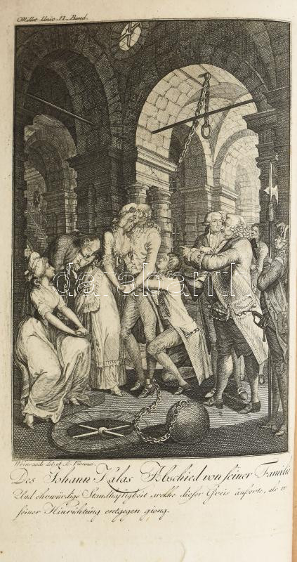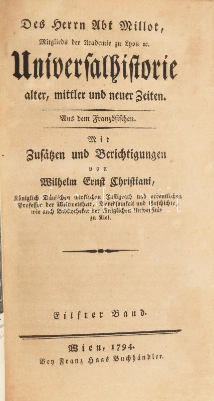 Christiani, Wilhelm Ernst: Universalhistorie alter, mittler und neuer Zeiten, 8.,11. (Eilfter),12.,14.,20. Bände. Wien,1794, Franz Haas, 4+XVI+399 p. ;1 t.+4+XVI+391 p.; 1 t.+4+XXIV+452 p.; 1 t. +4+IV+VII-XXIV+496 p.; 1 t.+4+XVI+306+XII+1 p. Német nyelven. Korabeli félbőr-kötés, kopott, foltos borítóval, részben foltos lapokkal, két gerinc sérült