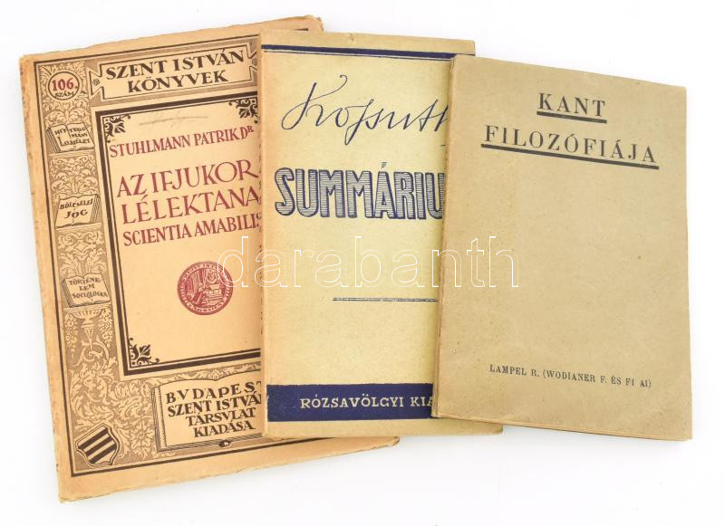 3 db könyv: Kant filozófiája. Gondolatok műveiből. Ford. és bevezetéssel ellátta: Dr. Polgár Gyula. Bp., [1914], Lampel R. (Wodianer F. és Fiai), 60 p. + Kossuth Summárium. Az ember, a gondolkodó, a politikus. Szerk.: Bátor István. Bp., [1948], Rózsavölgyi és Társa, 138 p. + Stuhlmann Patrik: Az ifjúkor lélektana. (Scientia amabilis). Bp., 1933, Szent István-Társulat, 178+(4) p. Kiadói papírkötés, változó állapotban.