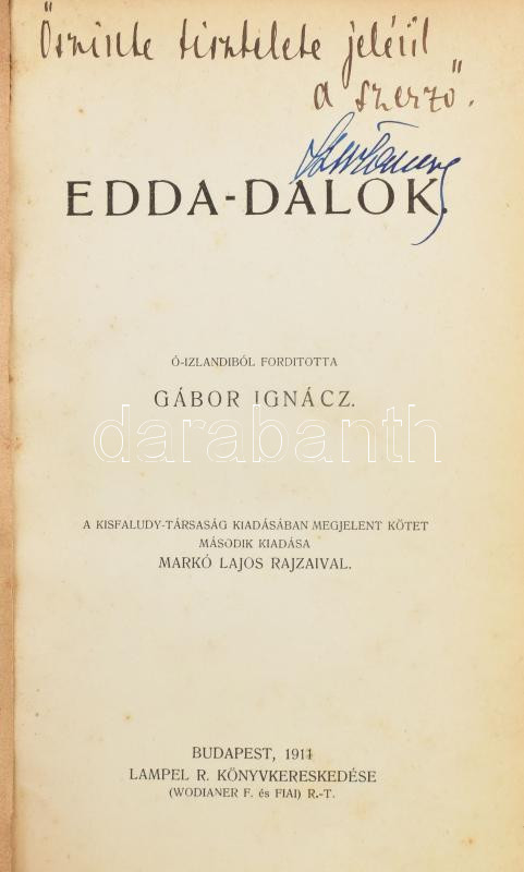Edda-dalok. Fordította Gábor Ignác. Markó Lajos rajzaival. Bp., 1903, Kisfaludy Társaság Kiadása. Kiadói aranyozott papírkötés, gerince sérült. DEDIKÁLT példány.
