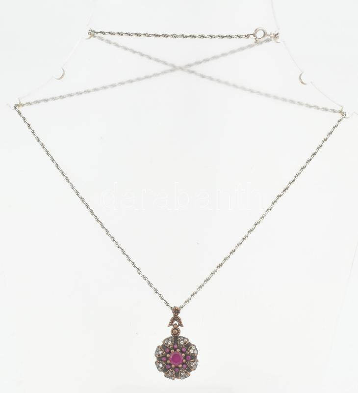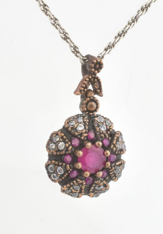 Ezüst(Ag) csavart nyaklánc rubin köves medállal, jelzett, h: 48 cm, bruttó: 7,4 g