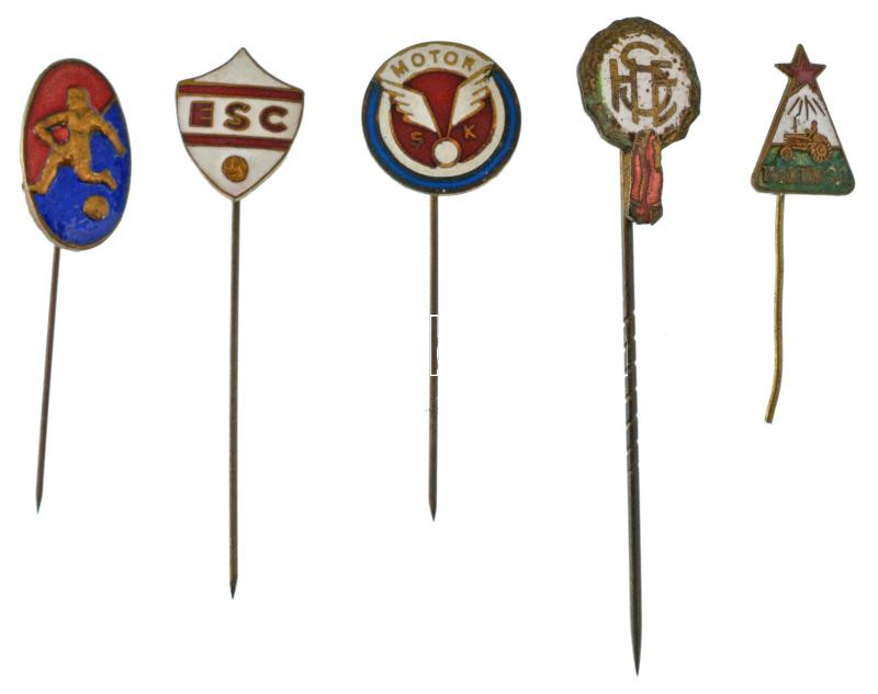 Description: 5db-os zománcozott sportjelvény-tétel, benne "ESC", "HLSE", "Traktor SE", "Motor SK", illetve piros-kék háttér előtt bronz futballjátékos sziluettje T:AU,XF
