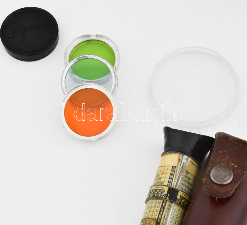 Zorkij szovjet távmérős fényképezőgép, Industar-22 50 mm 1:3,5 objektívvel, eredeti bőr tokjában + színszűrők + Bewi Junior II. fénymérővel