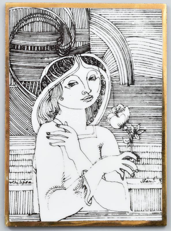 Hollóházi Szász Endre által tervezett porcelán kép, jelzett, matricás, sarkán sérüléssel, 12x8 cm